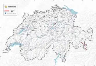 The Hauptstrasse 29 is a main road in the Swiss canton of Graubünden, with a total length of 51 km (32 mi). The road begins at a junction with Hauptstrasse 27 between Samedan and Pontresina, and passes Pontresina before climbing over the Bernina pass at a maximum elevation of 2,328 m (7,638 ft) above sea level. From the summit of the pass the road descends into the Val di Poschiavo and passes through San Carlo, Poschiavo, Le Prese and Brusio before reaching the border with Italy at Campocologno.[1]