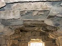 The tensile strength of basalt enabled the "development of unusual building techniques", according to historian Warwick Ball.[10] Among these methods was the cutting of long, narrow beams from basalt to roof large areas spanning 10 meters (33 ft) or longer.[10][89] Because of the size restrictions of the beams, a distinctive system of traverse, semi-circular arches was devised to support the roof.[89][90] Corbels, typically no longer than 4 meters (13 ft), were used to expand the intervals between the arches and the walls.[90] This method "gave rise to the distinctive, cantilevered 'slab and lintel' architectural style that is peculiar to the black basalt areas of the Hauran", according to Ball.[10]