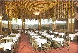 The Rheinterrasse (Rhine terrace) on the third floor in the circular section of the building, had a diorama to give the illusion of sitting outdoors overlooking the river between Sankt Goar and the Lorelei rock. A troupe of twenty "Rhine maidens" danced between the tables under hoops twined with grape vines.[54] Hourly thunderstorms were created by lighting and sound effects; one American visitor reputedly "beam[ed] like a movie theater façade on Broadway" when told about this.[56] The establishment used the motto: