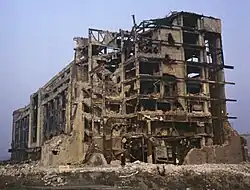 The building was finally completely burnt out on 17 June 1953, along with Erich Mendelsohn's Columbushaus, during the East German strike and protest.[40] It was then left in ruins, the windows simply being walled up. It was adjacent to the Berlin Wall after its construction in 1961.[29] In 1966 Der Spiegel described the desolation of the Potsdamer Platz during those years, with birch trees growing out of the rubble of what had been the busiest traffic intersection in Europe and kestrels nesting in the ruin of Haus Vaterland and hunting rats which emerged from locked S-Bahn entrances.[41]