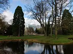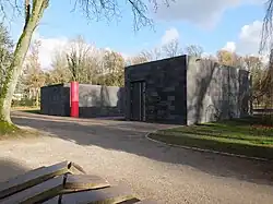 On the initiative of Alexander von Berswordt-Wallrabe, Situation Kunst (for Max Imdahl), a contemporary art collection with sculptures and paintings, was created in the park of Haus Weitmar starting in the late 1980s, which he donated to the art collection of the Ruhr University Bochum in 1990. The collection was created in memory of the art historian Max Imdahl, who became the first holder of the Chair of Art History at Bochum University in 1965. A building was completed for Situation Kunst in May 2010 as part of the Ruhr.2010, providing around 1,200 square meters of space for cultural and scientific events, exhibitions, and storage and workrooms.[20] The building, called Kubus, was built according to designs by the architects Pfeiffer, Ellermann and Preckel from Münster[17] and built into the Weitmar manor house ruins. In the course of its completion, the estate's old moat was refilled with water. On 13 November 2015 an underground extension of the Situation Kunst opened with the Museum unter Tage (MuT).[21]