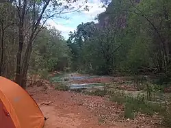 There are many picnic tables on the opposite side of the creek, and it is easy to cross over by following the edges of the pools. Swimming behind the falls and entering a small rock shelter behind it is possible. However, drownings have occurred.[6] There is no access to drinking water from the trailhead parking lot to the Supai Village. Hikers are advised to bring their water with them. In Supai, there is a general store and cafe where food and beverage can be purchased.[7] The hike from Hualapai Hilltop to the lodge and tourist office in Supai is 8 mi (13 km). 2 mi (3 km) is an additional hike to the falls and campground.[8]