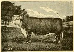 Thomas Lewis founded his Hereford herd at The Woodhouse, Shobdon, Herefordshire in 1822,[2] 24 years before the publication of the first Hereford Cattle Herd Book. Many animals were exported from The Woodhouse Herd especially to the United States of America in the boom years of the 1880s,[3] although Hereford cattle had first been introduced to the country in either 1816 or 1817.[4] Among the 1880s sales was Woodhouse Dowager 6th whom Messrs. Gudgell & Simpson bought, along with Anxiety 4th,[note 1] in 1881[6] and became the cornerstone of the Hereford breed's presence in the US.[7] The policy of Gudgell and Simpson was to line breed their early imports, and their most notable achievement was the breeding of Prince Domino in 1914: he was probably the greatest bull in the early development of the North American Herefords.[8] There were at least eight crosses of Woodhouse Dowager 6th in the pedigree of this bull.