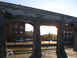 In the redevelopment of the area. a number of existing industrial structures was preserved and incorporated into the design of the park. This was done to commemorate the history of the site and to create a sense of place. The quayside still features the disused railway tracks and an old railway car contains an exhibition on the local history of the neighbourhood, rusty steel profiles have been left and now serves as pergolas, upon which Honeysuckle and Clematis are trained and bits of wall from now demolished buildings have been left.[4]