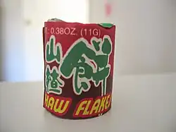 Haw flakes (Chinese: 山楂餠; pinyin: shānzhā bǐng) are Chinese sweets made from the fruit of the Chinese hawthorn.[1] The pale/dark pink candy is usually formed into discs two millimeters thick, and packaged in cylindrical stacks with label art resemblant of Chinese fireworks. The sweet and tangy snack is usually served to guests along with tea or as a treat for children.[2] It is sometimes consumed with bitter Chinese herbal medicine to aid digestion.[1]