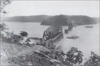 The Union Bridge Company of New York was awarded the contract to construct the bridge in January 1886. The railways engineer-in-chief, John Whitton, who designed and built the railway was not invited to design the bridge due to fallout from a mid 1880s enquiry into railway bridges.[1] However, subcontractors were also involved in the actual construction work. The piers consisted of concrete below water with sandstone masonry above. The spans were assembled on Dangar Island and floated 1,500 metres (4,921 ft) or so across to the bridge site on barges.