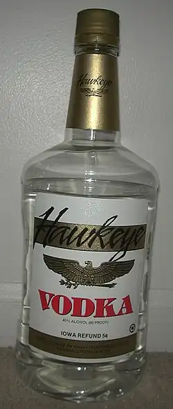In Iowa, as of February 2012, Hawkeye vodka is the top-selling vodka[2][3] and the #3 best selling liquor brand, and the Hawkeye whiskey blend and light rum brands rank #65 and #72, respectively.[2] Hawkeye vodka is distilled in St. Louis, Missouri, and is known for its low price.[3][4]
