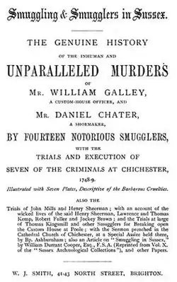 - ^ A gentleman at Chichester; Cooper, William Durrant (c. 1858). The Genuine history of the inhuman and unparalleled murders of Mr. William Galley, a custom-house officer, and Mr. Daniel Chater, a shoemaker, by fourteen notorious smugglers, with the trials and execution of seven of the criminals at Chichester, 1748-9. Robarts - University of Toronto. Brighton, [Eng.] : W.J. Smith.