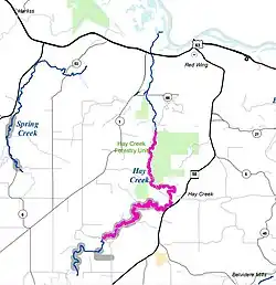 Hay Creek is a small trout stream in southeastern Minnesota. It has its headwaters west of Goodhue and empties into the Mississippi River just to the north of Red Wing.[2] It runs 25.1 miles (40.4 km).[3] Hay Creek was named for the hay meadows near its banks.[4] A railroad once ran along Hay Creek from the claybanks near Goodhue to the pottery and stoneware factories in Red Wing, which also made use of the water from the creek. The railroad was torn up in 1937, but traces such as trestle pilings remain.[5]