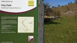 Hay Dale is part of the Derbyshire Dales National Nature Reserve. Natural England manages the reserve which covers five separate dales of the White Peak (Lathkill Dale, Cressbrook Dale, Hay Dale, Long Dale and Monk's Dale). The Carboniferous limestone rocks of the reserve were formed 350 million years ago from the shells and sediments of a tropical sea. The landscape was then sculpted by the ice sheets from the last Ice Age 20,000 years ago. The reserve contains ash woodland, limestone grassland and many wildflowers including early purple orchid, cowslip, common rock rose and thyme. Butterflies are abundant and include the brown argus.[2]