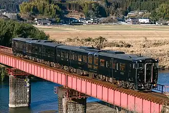 The train was formed of two specially converted diesel multiple unit (DMU) cars, KiHa 147-1045 and KiHa 47-8092. Initially, the train consisted of KiHa 147-1045 as reserved seating car 1 and KiHa 140-2066 as non-reserved seating car 2. From January 2006, a third car, KiHa 47-8092, was converted for use as reserved seating car 1, with KiHa 147-1045 as non-reserved seating car 2. KiHa 140-2066 was used as a spare car to make 3-car formations at busy periods,[1] but was later rebuilt as a third car for use in the Ibusuki no Tamatebako DMU set, returning to service in March 2012.[3]
