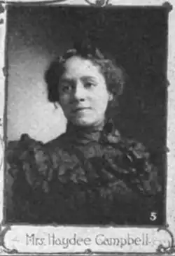 Campbell taught kindergarten in St. Louis, Missouri.[3] In 1882, Haydee Campbell was hired to supervise kindergarten programs for African-American children in the public schools of St. Louis. Beginning in 1896, she chaired the Kindergarten Department of the National Association of Colored Women's Clubs.[4] In 1899, she addressed the NACW national convention in Chicago on the topic "Why the National Association of Colored Women Should Devise Means for Establishing Kindergartens".[5] An attendee reported, "Her enunciation was exquisite...her words were well chosen and her subject well handled."[6] In 1903, she managed the kindergarten programming at the Tuskegee Institute Summer School for Teachers.[7]