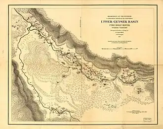 On July 31, 1871, Hayden and some members of his survey team left Yellowstone Lake (others stayed at the lake to tend the boat and supplies) and ventured back into the Hayden Valley where at the Crater Hills Geyser group they proceeded due west en route the geyser basins of the Madison River drainage. They eventually reached the headwaters of Nez Percé Creek 44°34′40″N 110°37′13″W / 44.57778°N 110.62028°W, traveling down the creek until they camped about 6 miles (9.7 km) from the Firehole River. The party spent several days in the Lower, Midway and Upper Geyser basins finally departing on August 6, 1871.