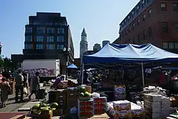 The market takes its name from Haymarket Square, a former town square that was located a block to the north, where some vendors operated during the 19th century and the first half of the 20th century.[17]: 40 The market is located on the Freedom Trail, adjacent to the Blackstone Block Historic District, which is "the oldest extant city block in the country."[31] This part of Boston has been called the "Market District" since at least 1910.[32] The name was in use through at least the 1950s,[33] then fell out of use,[17]: 7 and has recently been revived.[6] The Market District also includes the indoor Boston Public Market (which opened in 2015), Quincy Market, and a market in the proposed Haymarket Square Hotel.[34]