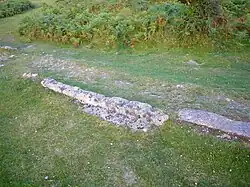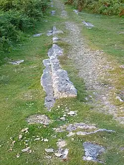 The construction is exceedingly unusual, the closest possibly being the Weedon Stoneway in Northamptonshire of 1837 which was built at great expense as a mail coach route by the Turnpike Commissioners who were in competition with the newly constructed London & Birmingham Railway. The only other comparable tramway known to exist was a very short 3 ft gauge limestone line at Conisbrough, near Doncaster.[11] The tramway itself was built out of the granite it would carry and ran from the Haytor quarries to Ventiford Quay on the Stover Canal.[2] At first, it was about 7 miles (11 km) long, but it was later extended to about 9 or 10 miles (14 or 16 km) including the various sidings.[3] The hard granite stone was well-suited to the purpose as it can withstand high pressures and was laid in lieu of iron rails. The tramway had a mainline running down to the Stover canal and six branches or sidings running from the separate quarries. The sidings were altered several times during the existence of the line and track was often lifted and used elsewhere as circumstances demanded. Various minor and one substantial cutting, small embankments and a few short bridges exist along the length of the line. Owing to the nature of the 'rails' large parts of the old tramway still exist, especially in the area near Haytor itself.