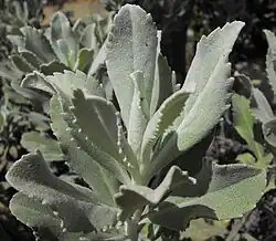 Hazardia detonsa is a bushy shrub reaching 60 centimetres (24 in) to 2.5 metres (8 ft 2 in) in height. It has densely woolly, glandular herbage of thick, serrated, oval-shaped leaves up to 14 centimetres (5.5 in) long. At the ends of its whitish stems it produces bell-shaped flower heads each about a centimeter long. Each flower head has several rows of white woolly phyllaries and an open end revealing disc florets and longer protruding ray florets. The florets are yellow and may age to red or purple.[4] The main threat to this species on Santa Cruz Island was the presence of feral Santa Cruz sheep. The sheep have been removed, allowing the plant to begin its recovery there.