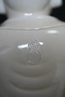 He Chaozong (Chinese: 何朝宗; pinyin: Hé Cháozōng) was a celebrated early 17th-century Chinese potter. He Chaozong fashioned mainly Buddhist white porcelain statuary in the tradition of the Dehua kilns in Fujian Province, known in the west as Blanc-de-Chine. Little documentary evidence remains for He Chaozong apart from extant examples of his ceramic art. A gazetteer entry for 1763 mentions him with other art notables of the Ming dynasty and establishes that the artist had earned a considerable reputation by his own day. His works identified by his seal are in an entirely different category than the usual Dehua statuary of the period and those later. They are thickly potted and exhibit an artistic expressiveness and creativity unmatched by thinner and standardized unsigned works. He Chaozong and the few other artists of the Dehua kilns were nearly unique in Chinese ceramic history which was characterized by anonymous and industrial scale production. Blumenfield in his Blanc de Chine presents the reader with what may be one of the few believable examples of the artist, replete with a hidden inscription visible to ultraviolet light. Of great interest is the manner of carving of the piece which shows none of the exuberant flowing robes of other examples of the master that may be simply just superficially attractive to the eye. Of additional interest in the Blumenfield book is the He Chaozong seal impressed on an additional Guanyin (p. 133) statue attributed to He Chaozong. All of the characters in the seal appear in reverse. This indicates that at least some seals on Dehua porcelain figures were akin to brands and perhaps of metal construction that could be mistakenly impressed in reverse. The outer borders of the Blumenfield seal, and the seal presented with the Manjusri statue accompanying this article, were both incised and evidently added after the characters were impressed on the bodies of the figures.
