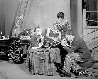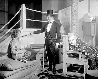 The action takes place within a circus in a large city in France.[1] In the opening scene a mysterious man, "He", approaches the circus performers and requests to join the troupe as a clown. Uncertain, the circus members recognize that the man is well educated and cultured by his speech and manner, but believe he may be an alcoholic. To win their approval, "He" suggests that his part in the circus act could be receiving slaps from the other clowns, and that his circus name could be "He Who Gets Slapped".[1] Andreyev's script keeps the audience guessing over the identity of "He", and information is divulged piecemeal over the course of the play's four acts.[1] This construct keeps the psychological aspects of the play at the center, as the audience is constantly trying to figure out what is motivating the central character.[1][4]