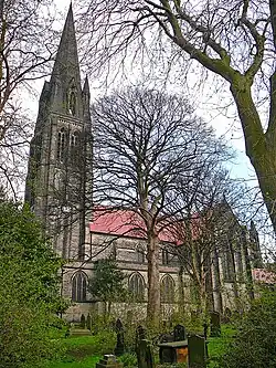 Headingley Parish Church is dedicated to St Michael and All Angels. It is a large, grade II* listed, steepled church on the corner of Otley Road and St Michael's Road, opposite the Skyrack public house.[23] The Church was built between 1884 and 1886 as the third church on this site. There is a separate parish of Far Headingley, with its parish church of St Chad's (also a large steepled church and grade II* listed).[24]
