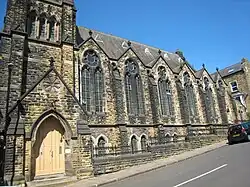 In terms of grounds, the church is set within a larger plot with a car park to the west side. Pathways from each entrance gate converge at the main steps, which are very wide with a central cast iron handrail, to form a grand ascent.[1] The surrounding gritstone ashlar wall is separately listed along with its gates, piers and cast iron railings.[10] There is also a secondary porch entrance on Cumberland Road.