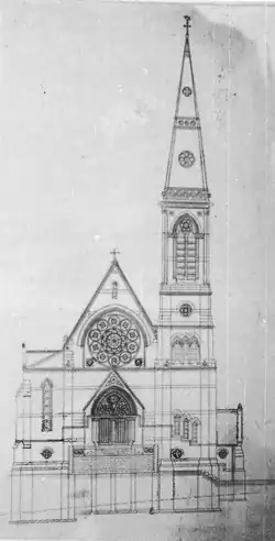 However, Brodrick chose to not submit an entry, and was replaced as the fourth contestant by Thomas Ambler.[5] The style stipulated by the committee was "Gothic with a spire or spirelet", and the cost was to be no more than £3,500 (later raised to £4,500).[4] Headingley Hill was a congregational church, in line with Protestant beliefs and reformed traditions but without a need to follow the traditional church architecture plan or the more Catholic practice of pictorial representation.[1] Three of the four architects put forward a design, and though the one from Hill was considered best, the committee rejected them all and decided to start anew, directly inviting Brodrick to be their architect that May.[4]