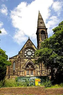 The exterior of the church building is constructed of rock-faced coursed gritstone with carved ashlar details and dressings, and leaded glass windows. On a rectangular plan, each long side of the church has six gabled bays, which each contain a tall two-light window within a pointed head.[1] A buttress topped with a crouching grotesque is between each pair of bays. On the main south frontage to Headingley Lane, there is a Gothic entrance portal with two non-original doors separated by a central red stone colonette, and two similar colonettes to the side of each door. Above, within a larger pointed arch, is a rose window made up of ten small roundels around a large central pane.[4]