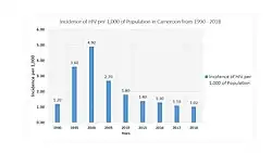 HIV/AIDS is the second cause of death in Cameroon in 2018 after malaria. Progress had been made in AIDS-related death and new infections in Cameroon; reduction in the number of deaths from 22,000 to 18,000 and the number of new infections from 36,000 to 23,000 between the years 2010 and 2018. In 2018, 540,000 people were living with HIV and the prevalence among adults (15–49 years) was 3.6%.[15] Moreover, the incidence among all people of all ages in Cameroon is 1.02% in 2018.[15] In Sub Saharan Africa, the incidence (new infections per 1,000 of population) among adults (15–49 years) declined from 3.39 in 2010, 2.49 in 2015 to 2.14 in 2017 and globally for adults it also declined from 0.44 to 0.40 between 2015 and 2017.[16]