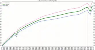 Life expectancy in Jordan was 74 years in 2021.[1][2] 99% of Jordan's population have access to clean water and sanitation despite it being one of the world's poorest in water resources. There were 203 physicians per 100,000 people in the years 2000–2004, a proportion comparable to many developed countries and higher than most of the developing world.[3]