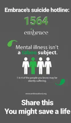 There is, on average, an attempted suicide 6 hours in Lebanon, with a death by suicide every 2.5 days. “Embrace Lifeline”, Lebanon’s first suicide prevention hotline was established in 2016. This is part of the “Mental Health and Substance Use-Prevention, Promotion and Treatment-Strategy for Lebanon 2015–2020", launched by the Lebanese Ministry of Public Health to create a more effective and comprehensive mental health treatment infrastructure in Lebanon.[20]