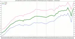 In 2018, the life expectancy at birth is 76.77.[26] This varies for men and women, at 74.317 [5] and 79.199[6] respectively. The current life expectancy is higher than the past several years. For example, in 2010 it was 75.151, and in 2000 it was 73.228.[26] There are various proposed reasons to account for the increase in life expectancy. Some studies have suggested that living in an urban centre results in a longer life, compared to those living rurally.[27] The rural population of Montenegro declined to 35.78% in 2016, compared to 81.21% in 1960.[28]