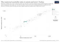 According to the WHO data between the years 2000 to 2017, Maternal mortality ratio (MMR) in Turkey has decreased from 42 to 17 in 17 years.[13] In 2010, Turkey was nearly on par with some of the other OECD countries such as South Korea and Hungary and had a lower maternal mortality ratio than the United States.[14]