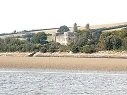 Heanton Court, the former manor house of the Manor of Heanton Punchardon, is a grade II listed building[6] situated on the north shore-line of the River Taw estuary, about a mile south-east of the parish church. Rev. John Swete described the house in spring 1796 as "the seat of Col. Basset" and wrote of it that "The house exhibits itself handsomely though its situation (like that of Lord Heathfield's on the Exe [i.e. Nutwell]) seems to be too contiguous to the water. Nearly opposite to it was a large track of marsh and sand..." He later made a copy of a painting by William Payne, c. 1790,[b][7] The house as painted by Swete in about 1797 is essentially as it survives today, retaining its battlements and corner towers. It is currently used as a public house and hotel, known in 2015 as the Braunton Inn. In 2019 known as Heanton Court.