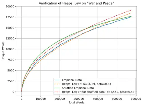Empirically, Heaps' law is preserved even when the document is randomly shuffled,[4] meaning that it does not depend on the ordering of words, but only the frequency of words.[5] This is used as evidence for deriving Heaps' law from Zipf's law.[4]