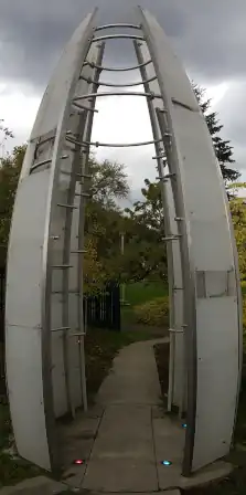 Heart Beacon, installed at the Emergency Coordination Center (3732 Southeast 99th Avenue or 9911 Southeast Bush Street) in Portland's Lents and Powellhurst-Gilbert neighborhoods, has been described as a "pulsing blue egg"; the artists have called it an "interactive enclosure of light, color and sound that senses and artistically displays the heartbeat of visitors".[1][2] It is made of stainless steel, acrylic panels, and electrical components, and measures 18' 1 7/8" x 10' 5". The sculpture cost $220,333 and was funded by the city's Percent for Art program.[1][2] According to the Regional Arts & Culture Council, which administers the work, Heart Beacon "takes the literal and metamorphic 'pulse'" of Portland's community and serves as a "symbol of hope and a potent reminder of the resilience of the individual taking inspiration from the life-saving mission" of the center.[1]