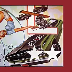 The cover art (including an image of a 1971 Plymouth Duster 340 and an Alberto Vargas pin-up model[17][18]) is from a 1972 piece by Peter Phillips called Art-O-Matic Loop di Loop.[19]