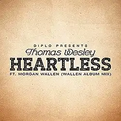 "Heartless" is a song by American producer Diplo, released under his country-inspired alias Thomas Wesley, and features vocals from American country singer Morgan Wallen. It was released through Mad Decent and Columbia Records on August 16, 2019. The music video was directed by Brandon Dermer and premiered on September 5, 2019.[3]