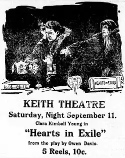 Hearts in Exile is a 1915 American film directed by James Young. It was produced by Peerless Pictures Studios when it and many other early film studios in America's first motion picture industry were based in Fort Lee, New Jersey at the beginning of the 20th century.[1][2][3] A print of the film survives in the Archiva Nationala de Filme film archive.[4]