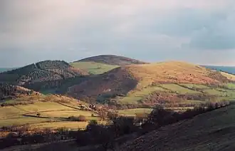 Heath Mynd is a hill in the English county of Shropshire. At a height of 452 metres (1,483 ft) it is fairly unnotable except for its Marilyn status,[1] a feature caused by the sharp drop on all sides. It is connected to Corndon Hill by a low col, and is only just inside England, being just one mile from the border with Wales. The nearby village is Norbury; nearest towns are Bishop's Castle and Church Stretton. Its nearest neighbour (visible in the photo) is called Cefn Gunthly.