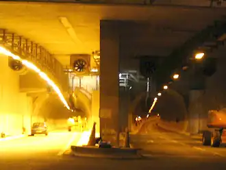 Each bore contains an unusual road layout, consisting of a single carriageway 6 metres (20 ft) wide; just wide enough to allow an airport bus (Cobus 2700) to drive past another bus stopped at the side of the road. The two tunnels are linked by escape cross-passages at intervals of 100 to 130 metres (330–430 ft).