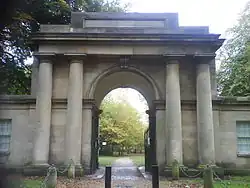Commissioned in 1807 by Sir Thomas Egerton, the Grand Lodge was designed by Lewis Wyatt as an impressive main entrance to the park from the south. The lodge is built of ashlar sandstone as a large triumphal arch and originally led onto one of the longest carriage drives to the house. It has two floors of accommodation, cellars under the west wing and an attic over the arch. The construction of the lodge completed the enclosure of the park by a 10-foot (3.0 m) high boundary wall.[30] It was refurbished as part of the millennium project and is now rented out to the public as short stay accommodation. There is a memorial plaque here dedicated to the memory of the Manchester Pals who trained in the park in 1914.