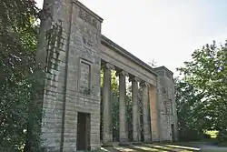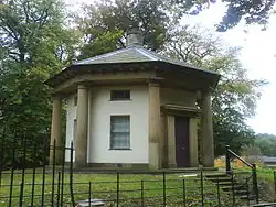Designed by James Wyatt in 1800 for Thomas Egerton, 1st Earl of Wilton, the ornamental temple is a simple, small rotunda of Tuscan columns with a domed roof and lantern. This Grade II listed building stands on the highest point of the city of Manchester giving views across the golf course, which was originally the deer park.[29] It has its own fireplace and is thought to have been used as an observatory by the Earl who is known to have owned a telescope bought from Dollond's of London. The cost of the telescope was £18.5s.0d (£18.25) – the same amount earned in a year by the Earl's under-butler. The temple has recently been enclosed by a stone balustrade and gravelled path and is used as a summer studio for artists, and for astronomy sessions.[12]