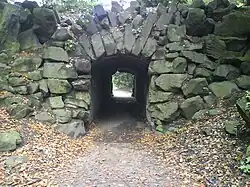 These ornamental gardens were probably laid out in the early 19th century as a peaceful retreat for the family. The gardens have recently been returned to their original design with pools, summerhouses and plants appropriate to the period. A tunnel leads from the flowergarden to the dell and carries a causeway at high level across the gardens to allow the cattle, from the fields to the south of the garden, to be taken to the farm for milking without entering the gardens. The tunnel entrance is faced with large stones to give it the appearance of a natural cave.