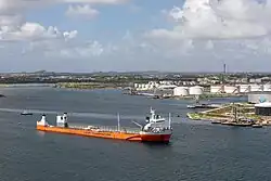 Semi-submersible ships take on water to allow the load—usually another vessel—to be floated over the deck and raised above the waterline.[2] Its ballast tanks are flooded to lower the well deck below the water's surface, allowing oil platforms, other vessels, or other floating cargo to be moved into position for loading (float-on/float-off). The tanks are then pumped out, and the well deck rises to bear the load. To balance the cargo, the tanks can be pumped out unevenly.[2] They typically have a long and low well deck between a forward pilot house and an aft machinery space.[2] In superficial appearance, it is somewhat similar to a dry bulk carrier or some forms of oil tanker.[2]