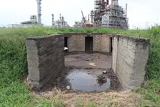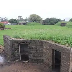 After the war, Brisbane's defences were dismantled. By 1963, the Lytton gun station's accommodation huts had been removed, although the gun emplacements, command post and two reserve magazines remained. That year several fuel tanks, part of a new Ampol refinery, were already under construction, to the north of the gun station. The defence reserve was not transferred from the Commonwealth to Ampol until 1964.[55][56] The southwestern reserve magazine and the house which had been used as an officer's mess were removed in the 1960s; the northern reserve magazine and the earth revetment on the west side of the northernmost gun emplacement were removed in the 1970s.[57] In 1990, Fort Lytton was declared a Historic National Park, after being relinquished by Ampol. The remaining refinery land, including the former GS 385, later became a Caltex refinery. In 1999, the National Park was extended to include part of the former quarantine station.[27][58] Photographs from inside the command post, taken in 2000, show caricatures of an Australian officer and a Japanese soldier, drawn on the walls. In 2019, the grassed site of GS 385 is fenced off, within the refinery.[1]