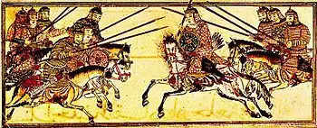 Heavy cavalry was a class of cavalry intended to deliver a battlefield charge and also to act as a tactical reserve; they are also often termed shock cavalry.[1] Although their equipment differed greatly depending on the region and historical period, heavy cavalry were generally mounted on large powerful warhorses, wore body armor, and armed with either lances, swords, maces, flails (disputed), battle axes, or war hammers; their mounts may also have been protected by barding. They were distinct from light cavalry, who were intended for raiding, reconnaissance, screening, skirmishing, patrolling, and tactical communications.[2]