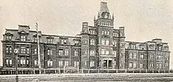In 1884 the Hebrew Benevolent Society constructed a large building at Amsterdam Avenue, between 136th and 138th Streets, in the Modern Renaissance style, designed by William H. Hume. The building cost $750,000 (including the land), and $60,000 a year to operate. The building eventually had a capacity of 1,755 children.[7] It was self-sufficient enough that it was able to survive for a week on its own after it was cut off during the Blizzard of 1888. After a dysentery outbreak in 1898, caused by impurities in the city's water supply, left seven children dead, the building installed its own water filtration system. During the influenza epidemic of 1918 not a single child in the orphanage died.[9]
