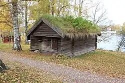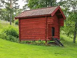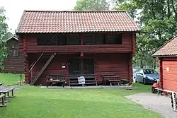 Körlogen (köra=drive;loge=a type of barn) is a former barn with doors large enough to let a horse cart in and out. The building was erect at Hedemora gammelgård in 1992-1994 and comes, like the härbre, from Skommargården in Ivarshyttan. | 60°17′4.8″N 15°58′39.5″E / 60.284667°N 15.977639°E | Körlogen, Hedemora gammelgård |