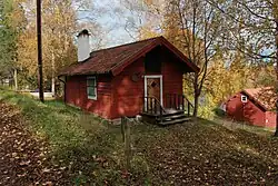 Dalska stugan (Da[h]l's cottage) was also a flax store from the 1800s. The cottage was Elin Dahl's summer home in Svensbo nearby Backa, and was donated to the Association Hedemora Gammelgård (Föreningen Hedemora Gammelgård) in connection with the celebration of the would-be 100th birthday of founding father Karl Trotzig. | 60°17′2.7″N 15°58′39.6″E / 60.284083°N 15.977667°E | Dalska stugan, Hedemora gammelgård |