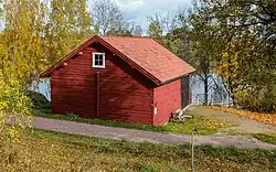 The kiln from 1757 was also present at the inauguration in 1915. The building was used for the drying of flax and grain, and comes from the Örjasgården in Västerby. | 60°17′0.6″N 15°58′44.2″E / 60.283500°N 15.978944°E | Bastun, Hedemora gammelgård |