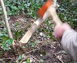 The theory behind laying a hedge is easy. The practice is much harder, requiring skill and experience. The aim is to reduce the thickness of the upright stems of the hedgerow trees by cutting away the wood on one side of the stem and in line with the course of the hedge. This being done, each remaining stem is laid down towards the horizontal, along the length of the hedge.[6]